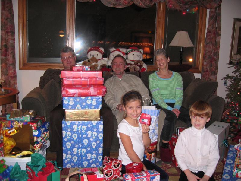 Uncle Mark (and his huge stack of presents), Kenny and Kathy (married), Sophie and Jack (siblings, my cousins, children of Darcy)